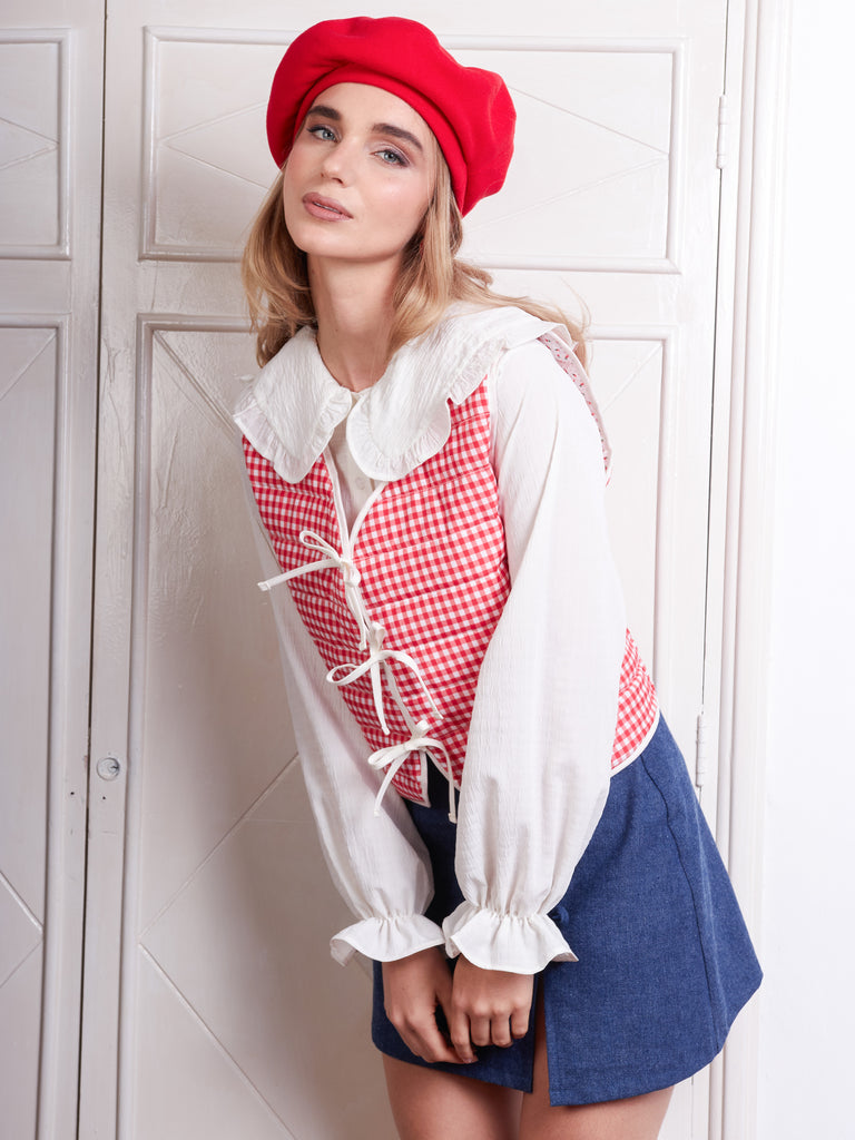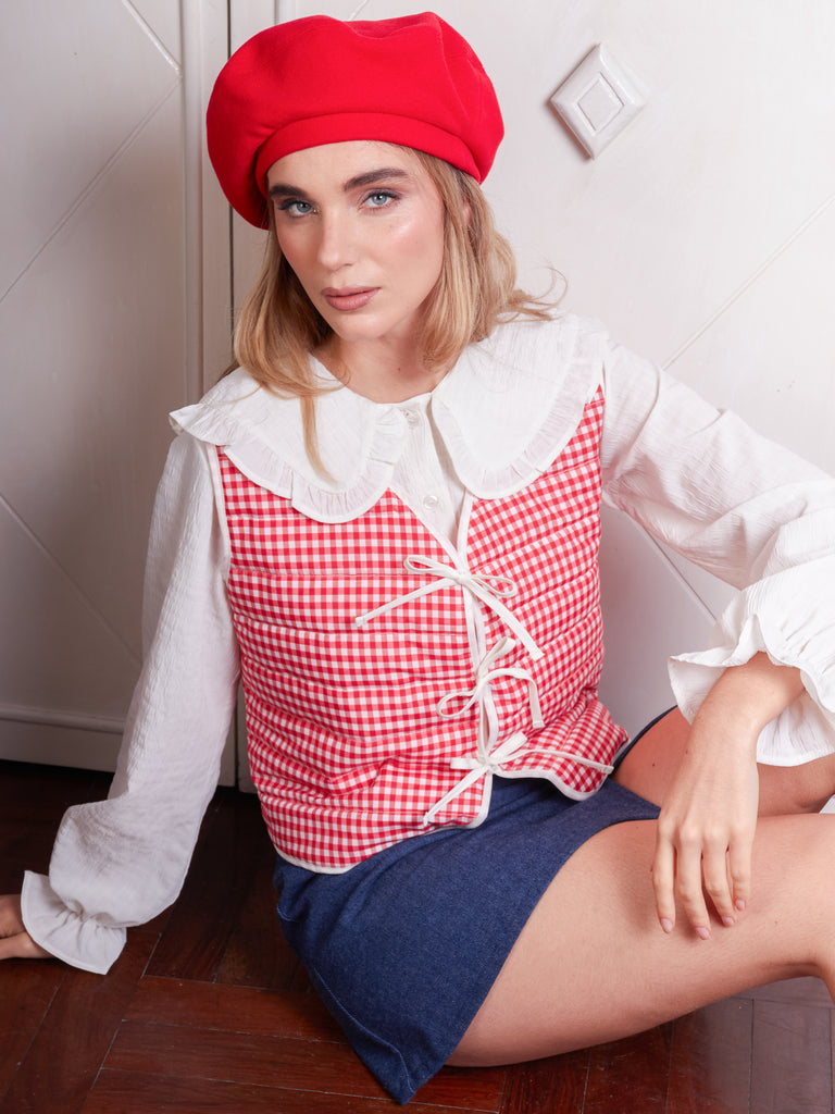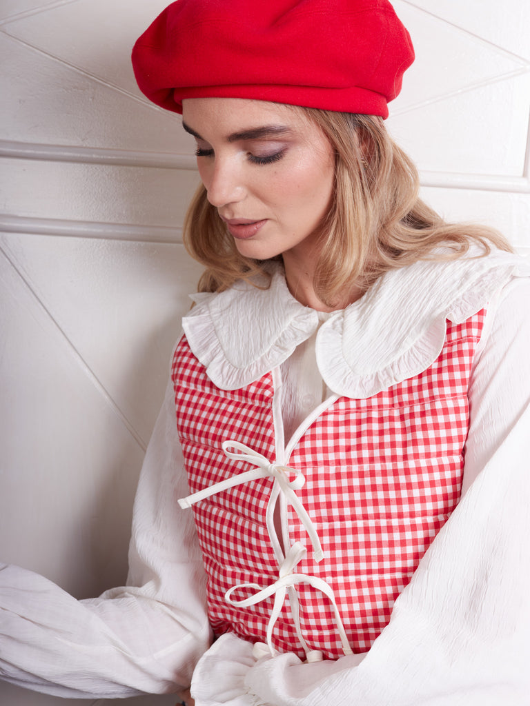 Chaleco acolchado y reversible: un lado con print de flores y el otro en vichy con lazos al centro y sesgo alrededor.