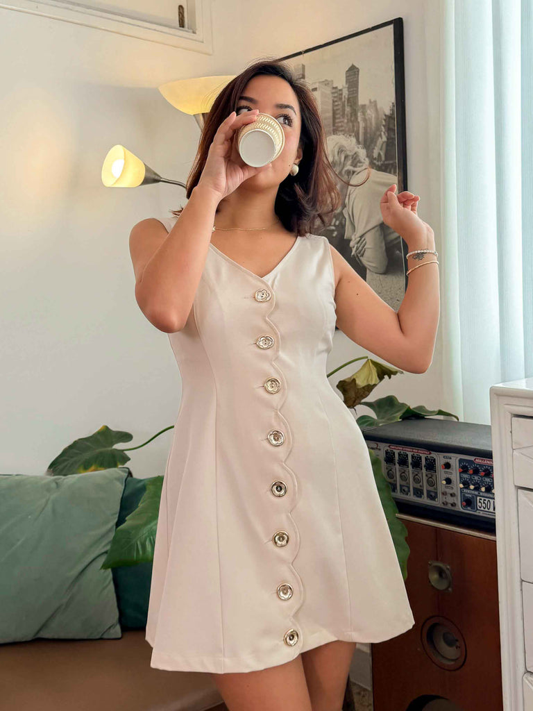 El vestido TWIGGY es un vestido corto manga cero con corte en A desde la cintura y ondas en la abertura de botones.