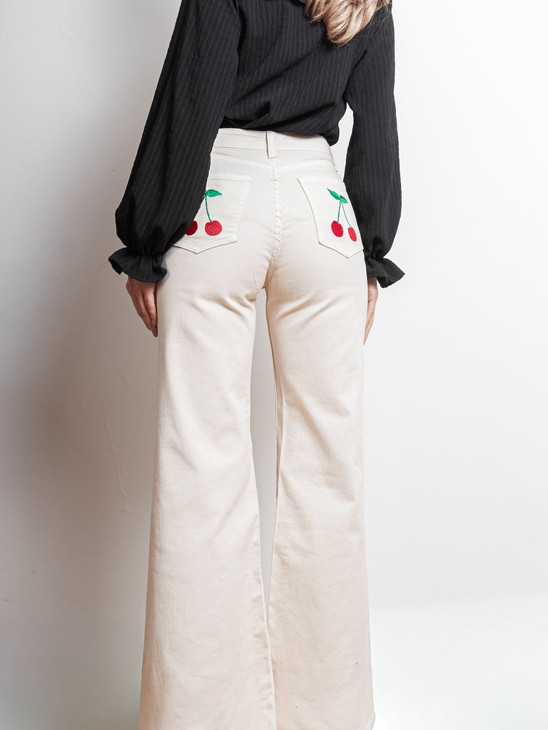 Este pantalón resalta por su fit favorecedor y divertido bordado de cerezas. Ideal para elevar tus looks diarios con un toque especial.